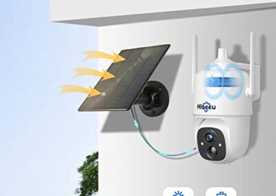 - Alimentation solaire, batterie rechargeable et 100 % sans fil : caméra de sécurité PTZ solaire Hiseeu alimentée par batterie pour l’extérieur, avec un panneau solaire de haute qualité et une batterie rechargeable de 9000 mAh pour que la caméra fonctionne en continu. Pas besoin de cordon d’alimentation ou de câble réseau, véritable connexion sans fil, évite les problèmes de câblage, facile à installer n’importe où en quelques minutes qui vous fera économiser beaucoup d’argent pour vous. Cette caméra de sécurité solaire peut fonctionner de 1 à 12 mois lorsqu’elle est pleine de charge. Plein soleil, le panneau solaire est chargé.