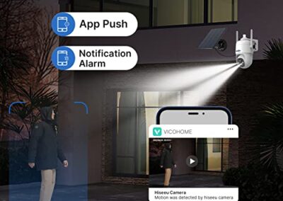 - Détection de mouvement PIR et alarme flash sirène : la caméra de sécurité Sola PTZ d’extérieur adopte la dernière technologie IA avec un grand angle de 110 degrés. Il analyse automatiquement les humains, les animaux domestiques, les véhicules et les colis via le capteur PIR surveille le mouvement. Vous recevrez la notification push sur l’application Vicohome de votre smartphone lors de la détection du mouvement, et enverra une courte vidéo à l’application. La lumière blanche clignote immédiatement avec la sirène qui s’allume en même temps. Dissuade efficacement les voleurs et protège la sécurité personnelle.