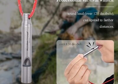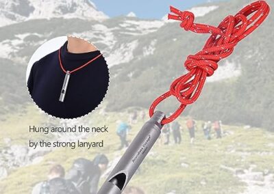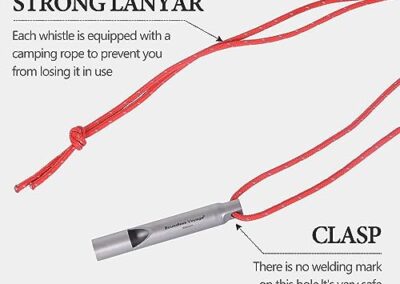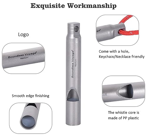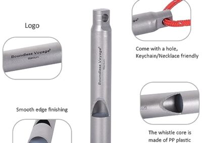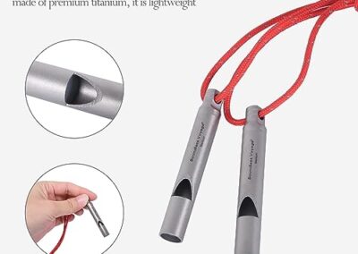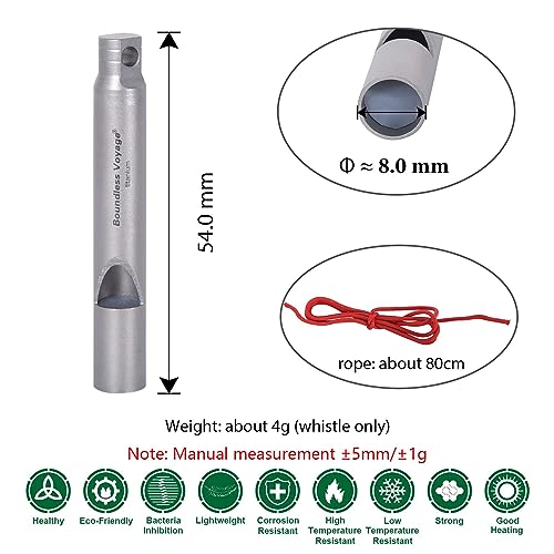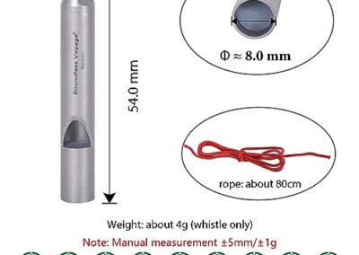 - Matériau : 99,8 % titane, plastique PP (noyau de sifflet) ; taille : Φ8 mm x (L)54 mm (sifflet), 80 cm (corde); poids : environ 4 g (sifflet uniquement), 5 g (sifflet + corde). Fabriqué en titane de qualité supérieure, il est léger, ne rouille pas, anti-corrosion de l’acide et des alcalins, résistant aux rayures et à la chaleur.