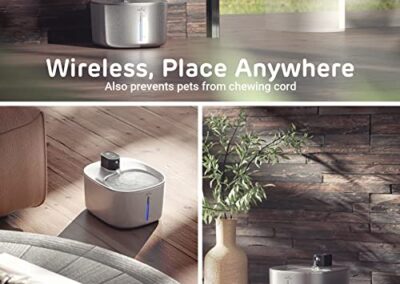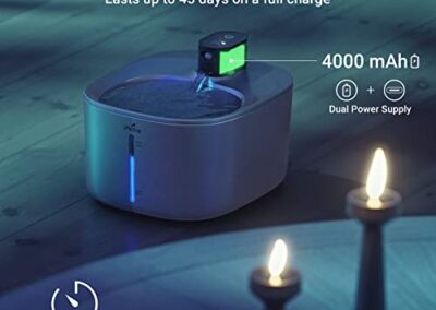 - Fontaine d’eau sans fil pour chats et chiens – Dites adieu aux fils emmêlés, vous pouvez placer la fontaine d’eau sans fil pour chat là où vos animaux en ont besoin, grâce à l’énorme batterie rechargeable. Une charge complète offre jusqu’à 45 jours d’autonomie. (Un adaptateur DC 5 V/1 A est requis et n’est pas inclus.)