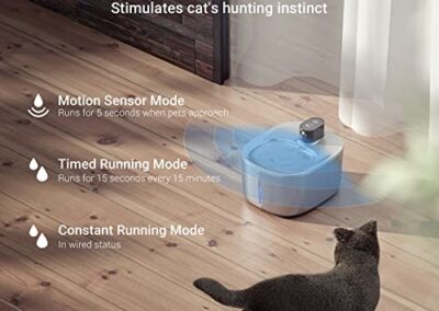 - 3 modes de débit d’eau – Le mode 1 encouragera et attirera les animaux à boire davantage. Notre fontaine dispose d’un capteur de mouvement et l’eau coulera pendant 5 secondes lorsque les animaux s’approchent. Le mode 2 est que l’eau coulera pendant 15 secondes toutes les 15 minutes, le mode 3 est que l’eau coulera en continu lorsque la fontaine est alimentée par un adaptateur. (non inclus) Vous pouvez passer à n’importe quel mode dont vous avez besoin.