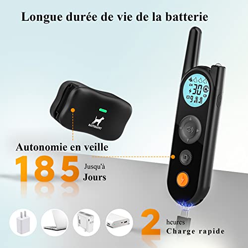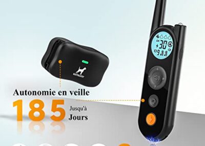- 【Longue Durée de Vie de la Batterie】 Ce collier électronique offre une autonomie de batterie qui dure longtemps, il ne prend que 2 heures pour être complètement chargé. La télécommande pour collier à électrochocs pour chien peut durer jusqu’à 185 jours en veille ! Le mode clôture électronique pour une utilisation prolongée devrait fonctionner pendant environ une semaine. Il est recommandé de quitter le mode clôture électronique lorsqu’il n’est pas utilisé afin d’économiser la batterie.