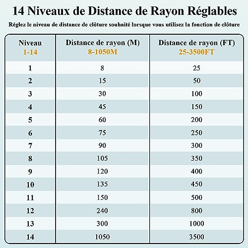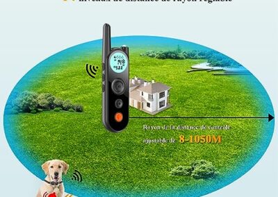 - 【Fonction de Clôture Électronique Améliorée】Régler le niveau de vibration et de choc électrique à l’avance, après l’ouverture du mode de clôture, régler le niveau de distance de rayon requis dans 14 niveaux de distance (8-1050m), lorsque le chien dépasse la distance de la clôture, l’alarme de la télécommande, le récepteur émet d’abord des bips 3 fois, puis des bips avec des vibrations 5 fois. Le collier ne déclenche pas automatiquement le choc.
