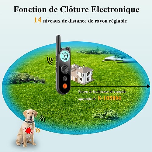 KAIYIKAPET Clôture Électronique et Collier pour Chien avec 14 Niveaux Distance (8-1050m), Système de Clôture, Collier de Dressage pour Chien avec Mode Vibration, Son, Choc, IPX7 Résistant à L’Eau
