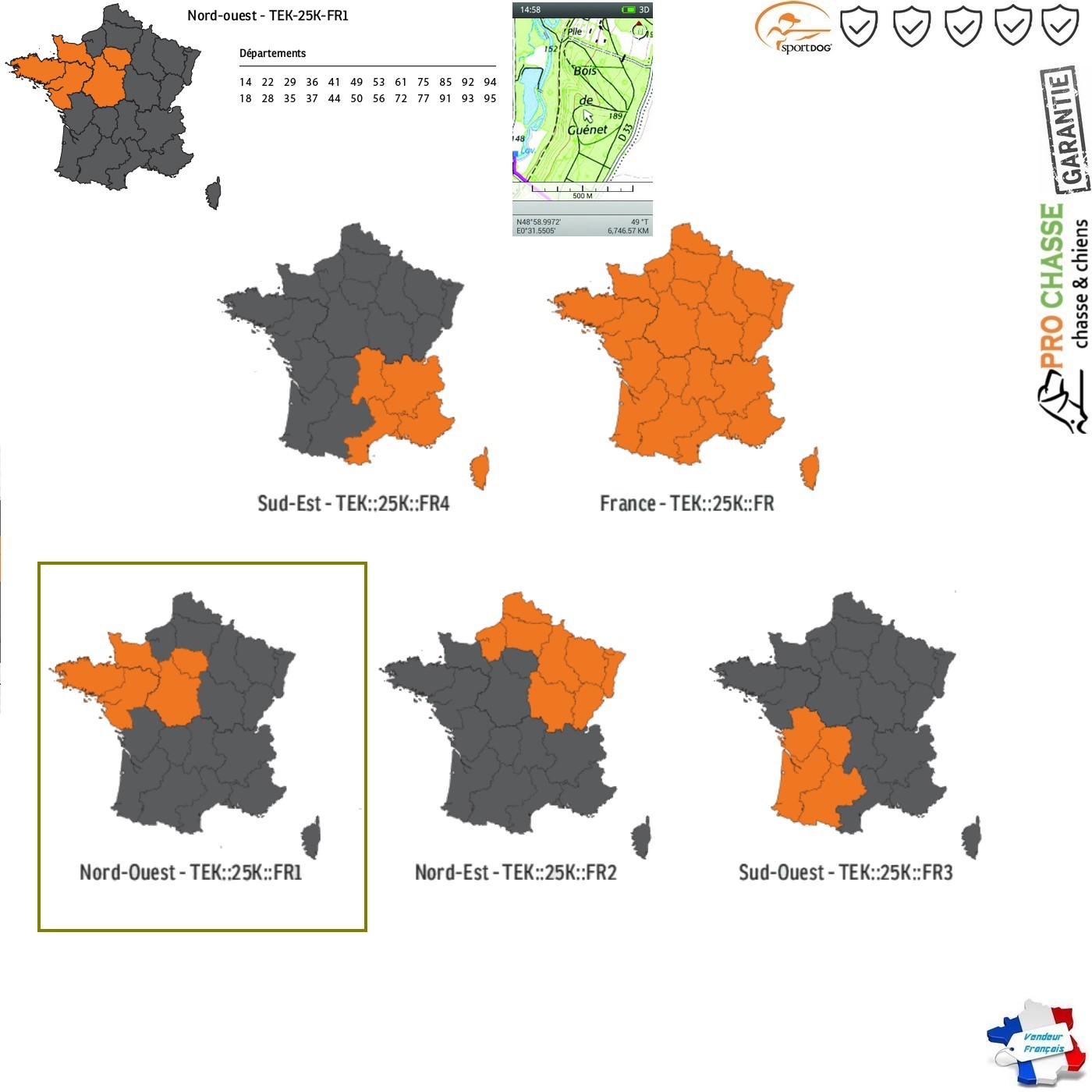 Carte Nord Ouest France pour les colliers GPS Tek 2.0 de SportDog. La carte topographique GPS SportDog Tek 2.0 de SportDog est une carte détaillée au 1/25000 ème. Pourvu des fonctions de dressage les plus évoluées du monde. Le TEK 2.0 est un collier électronique innovant doté d’un module de localisation GPS destiné à garantir. Grâce à l’ajout de nouvelles cartes détaillées spécialement développées pour le marché français. Les chasseurs disposeront de relevés topographiques bien détaillés.