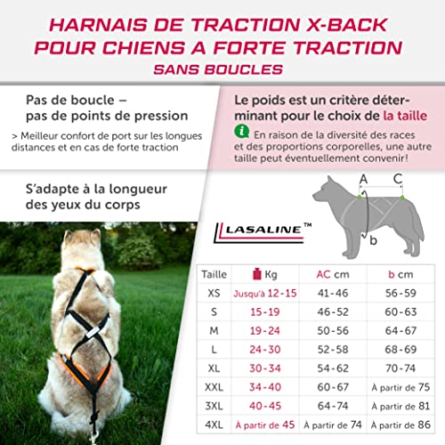 - POURQUOI UN HARNAIS DE TRACTION CHIENS LASALINE X BACK ? Notre harnais traction chien est idéal comme harnais chien sport pour les chiens qui ont une grande force de traction. Le design XBack assure une répartition uniforme de la pression, stabilise, soulage le dos et fait travailler les muscles dorsaux. Des épaules dégagées garantissent la liberté de mouvement. La zone thoracique libre sur les côtés favorise une respiration totalement dégagée.