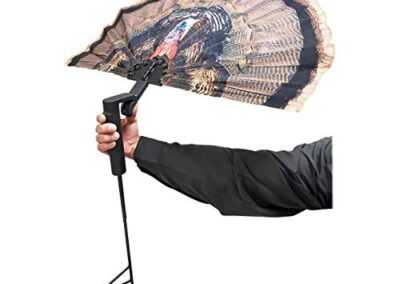 - Un éventail artificiel réaliste avec tête photo, monté sur un piquet sur une charnière avec onglet de pouce pratique qui permet au ventilateur d’être posé dans une position agressive