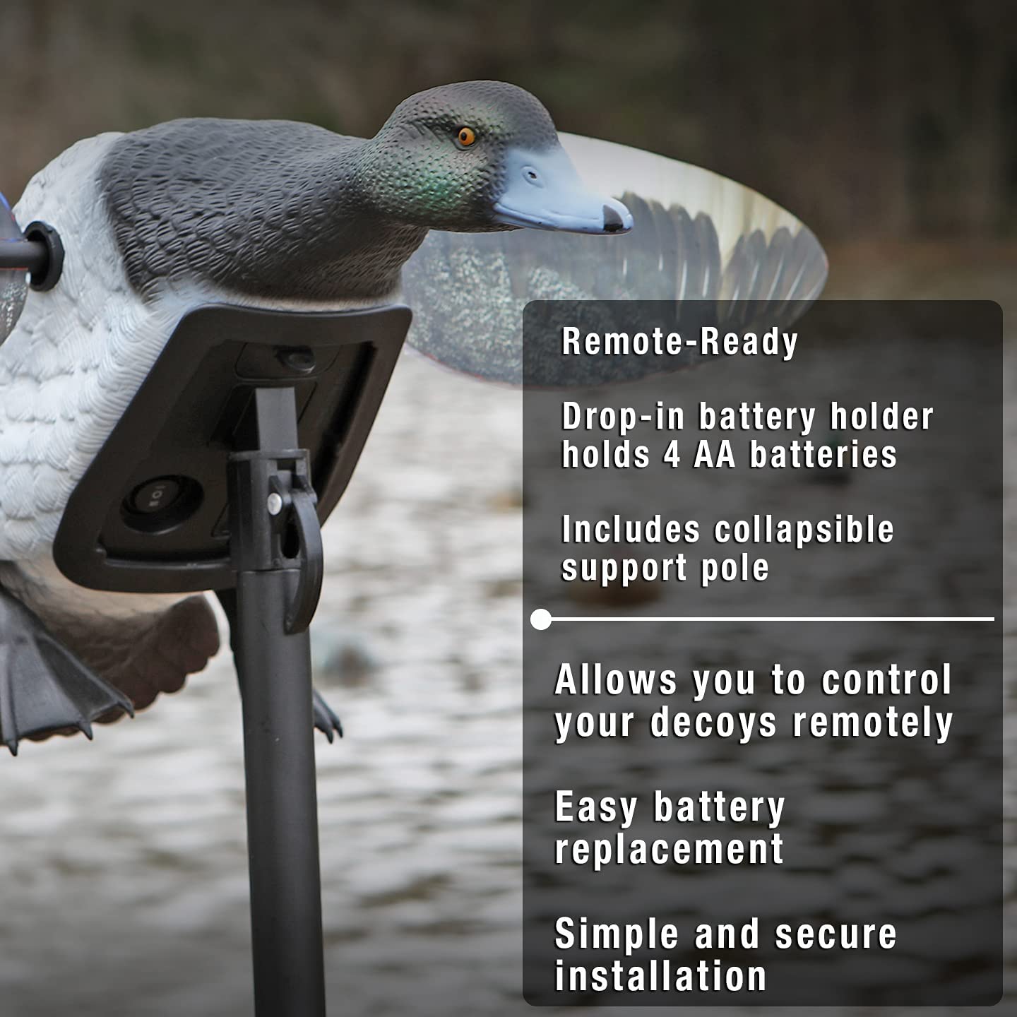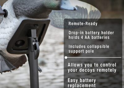 Le nouveau morillon à ailes tournantes Mojo Elite Series est livré ailes et piquet. Il fonctionne à l’aide de 4 piles AA non fournies.
