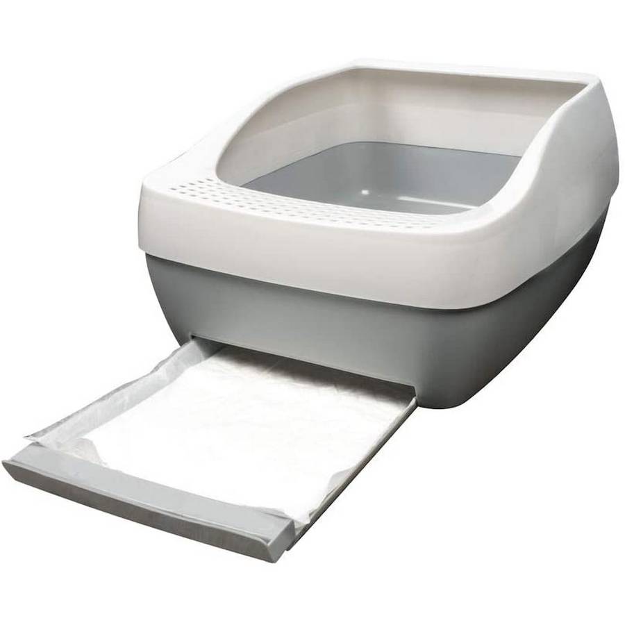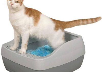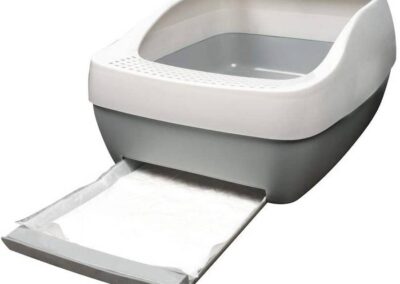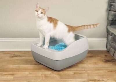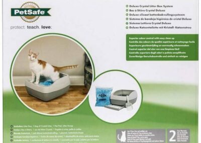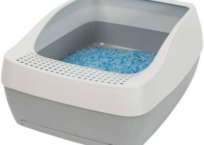 Des ouvertures le long de la partie inférieure du bac favorisent la circulation de l’air pour sécher la litière Crystal et prolonger ainsi sa durée de vie et sa fraîcheur. Une grille sur le devant du bac évite les projections de litière à l’extérieur du bac et sur le plancher. Un sac de litière Crystal dure jusqu’à un mois pour un foyer avec un seul chat. Le système comprend une pelle pour éliminer les excréments solides.