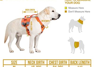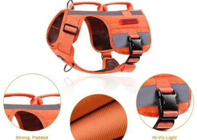 • Poignées doubles rembourrées avec coutures renforcées pour une assistance temporaire à la mobilité canine (escaliers haut/descendants/entrées/hors des voitures, kayaks, etc. ), son design vertical rend les poignées moins susceptibles de se coincer sur les branches et les arbustes.