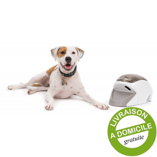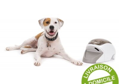 Dispositif de dressage et jouet distributeur de récompenses pour chien. Actionné par télécommande. L’objectif est d’apprendre les bons comportements à votre animal