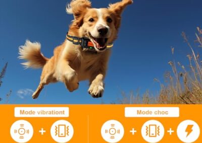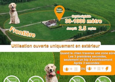 - 【Conception humaine】 : Bip + Vibration ; Bip + Vibration + Choc. 1). Les 3s premières lorsque le chien quitte la limite, seulement un bip d’avertissement. 2). Lorsque votre chien insiste pour échapper à la limite, il démarre 6 niveaux de bips augmentant progressivement, de vibrations/chocs, une pause d’une minute et répète 1 cycle. Si le chien ne revient toujours pas, il entrera en mode protection. 3). Lorsque le signal est mauvais, il cesse de fonctionner pour éviter un faux déclenchement.