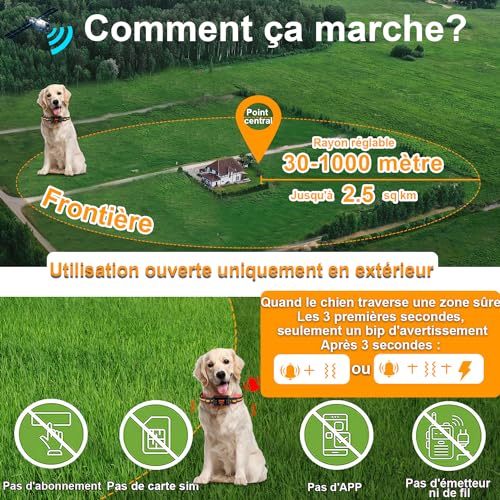 - 【Facile à utiliser en 4 étapes】 : 1). Rechercher des signaux et définir le point central ; 2). Définir le rayon et le mode ; 3). Testez-le, puis mettez-le sur le cou du chien et commencez le processus de dressage ; 4). Commencez à l’utiliser. Pas d’abonnement, pas de carte SIM, pas d’application, pas d’émetteur ni de fil ! Il est petit et portable. Parfait pour les personnes qui bougent beaucoup, aiment voyager, ont beaucoup de chiens, possèdent une propriété ou vivent en banlieue.