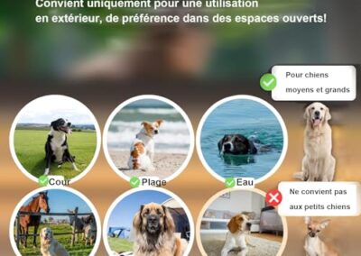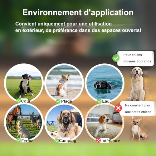 - 【Uniquement pour une utilisation des grands et extérieurs】 : Il est conçu uniquement pour les zones ouvertes et grandes en plein air, comme la ferme, la grande cour, la plage et d’autres grands endroits extérieurs, qui ne conviennent pas aux petits chantiers ou aux espaces intérieurs. Il peut couvrir une plage circulaire avec un rayon de 30 à 1000 mètres. Les sangles sont réglables de 20 à 66 cm, adaptées aux chiens moyens et grands de plus de 5 kg et plus de 6 mois.