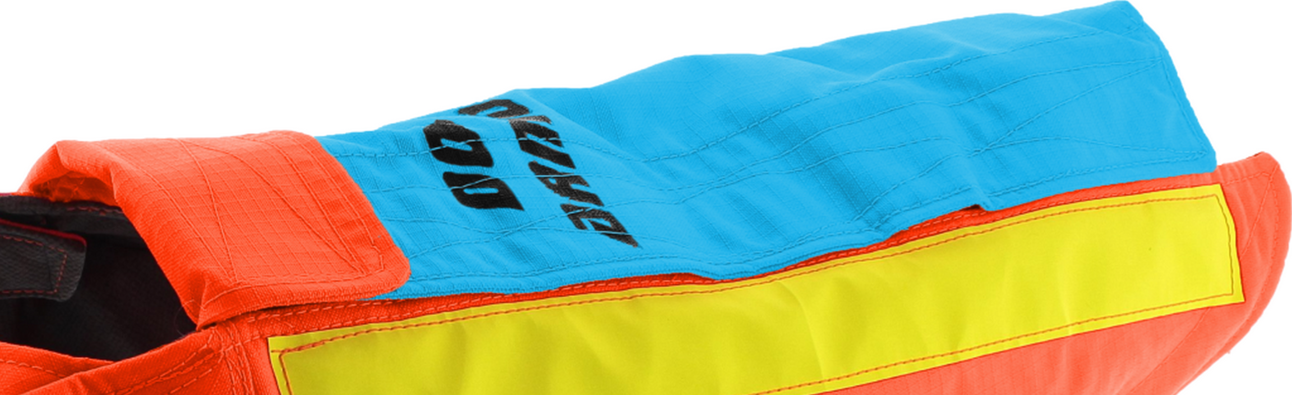Le rabat dorsal livré d’origine en orange, est en 3 autres couleurs : bleu, jaune et rose.