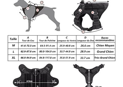 - Harnais pour Chien de Taille Moyenne: Ce harnais tactique chien est de tour de cou: 41.6-72.3cm, tour de poitrine: 64.5–91.4cm, sa longueur du ventre :25.9-40.8cm et sa longueur du dos: 26.6cm. Il est idéal pour les races telles que le Boston Terrier, le Teckel, le Heeler, le Bulldog, le Boxer, le Puggle, le Berger australien, etc. Un harnais chien de travail professionnel pour chiens de service, policiers ou militaires, mais aussi bon pour la chasse et tous les chiens de compagnie en plein air