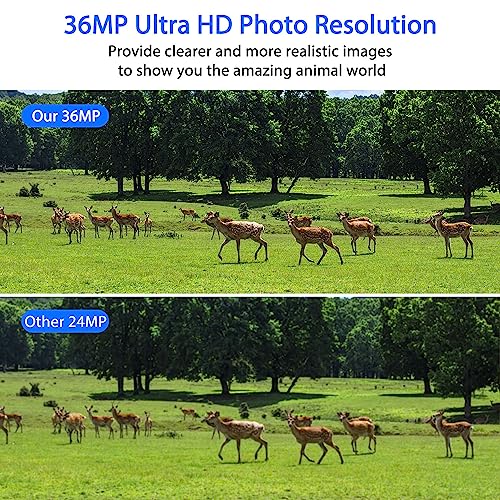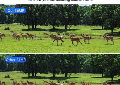 • Vidéo Ultra HD 4K et résolution d’image 36MP : Cette caméra de chasse offre une incroyable vidéo ultra-claire 4K (30 FPS) – 3840 x 2160 pixels et une image vive de 36 MP – 6928 x 5196 pixels. Les détails sont visibles de jour comme de nuit, vous pouvez donc vous approcher d’un monde d’animaux sauvages intacts. Pas seulement un appareil photo pour la chasse, mais aussi pour la conservation de la maison, la photographie de la faune ou la surveillance de la ferme.