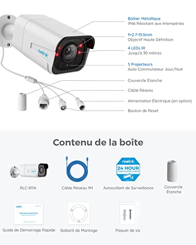 Reolink 4K Caméra de Surveillance Extérieure PoE avec Zoom Optique 5X, Vision Nocturne en Couleur, Audio Bidirectionnel, Détection de Personne/Véhicule, Alerte de Mouvement, Time-Lapse,RLC-811A