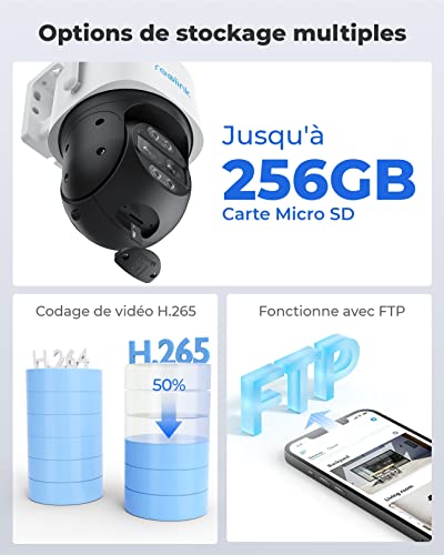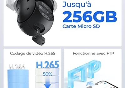 - Enregistrement Local et Stockage Flexible : La camera 5ghz wifi prend en charge une carte micro SD jusqu’à 256Go (non incluse) et le FTP pour le stockage. Elle adopte le codage vidéo H.265 à haut rendement pour économiser la moitié de la bande passante et de l’espace de stockage.
