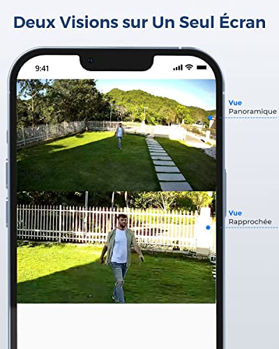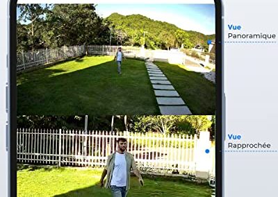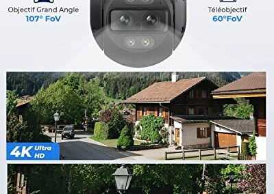 - Double Affichage sur Un Seul Écran: Connaître ce qui se passe autour de votre maison avec la double vue sur un seul écran. Le téléobjectif de 8 mm capture les détails en gros plan, tandis que l’objectif grand angle de 2,8 mm offre une vue panoramique.