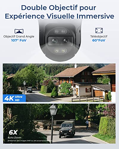 - Suivi Automatique et 6x Zoom: L’objectif PT à grand angle suit la cible, tandis que le téléobjectif zoome pour obtenir les détails. La vue rapprochée offre automatiquement des vues 2MP ou 4K. Il y a trois modes de suivi différents au choix pour mieux répondre à vos besoins.