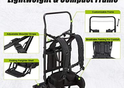 - Design ergonomique et confortable : le grand sac TideWe est conçu avec des bretelles et un cadre réglables, pour personnaliser votre taille. Le design ergonomique avec rembourrage doux et respirant offre une réduction de la pression qui rend les longues promenades beaucoup plus faciles et confortables sur votre corps. Le cadre supérieur incurvé est adapté à la position de votre tête, protégeant votre tête contre les chocs. Le cadre léger et compact, ainsi que l’étagère pliable, est parfait pour votre voyage de chasse.