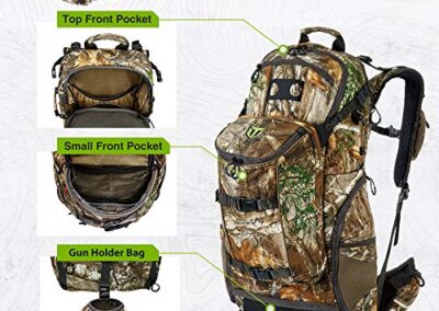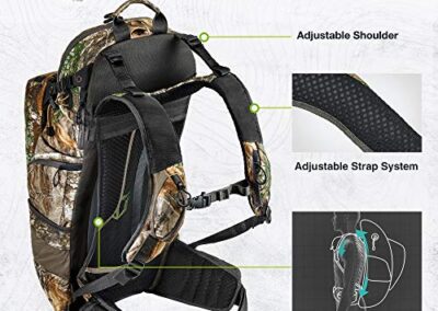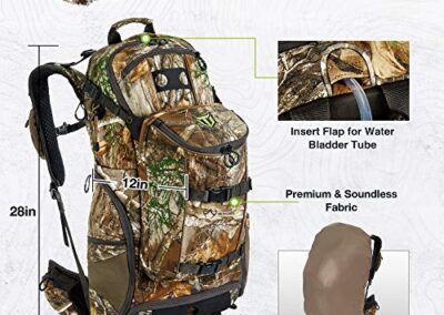 • Design convivial : ce sac à dos de chasse encadré est compatible avec les systèmes d’hydratation de 2 litres, vous gardant hydraté pour ces longues promenades dans les bois. Cela le rend également parfait pour les longues randonnées. Le tissu insonorisé de qualité supérieure vous aidera à rester indétecté pendant la chasse et la housse de pluie imperméable est parfaite pour garder l’ensemble de votre équipement au sec au cas où vous êtes pris sous la pluie. Le sac principal peut se détacher du cadre, vous permettant d’utiliser le sac à dos librement.