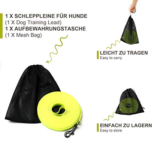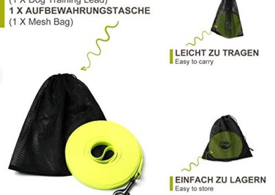 - ◆ RÉSISTANT À LA SALETÉ ET FACILE À NETTOYER ET À RANGER : La saleté est facile à nettoyer avec un détergent neutre et ne laisse rien sur la longue laisse du chien après le nettoyage. La laisse de dressage pour chien est livrée avec un sac en filet, facile à ranger et à transporter