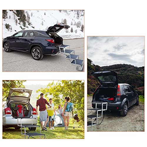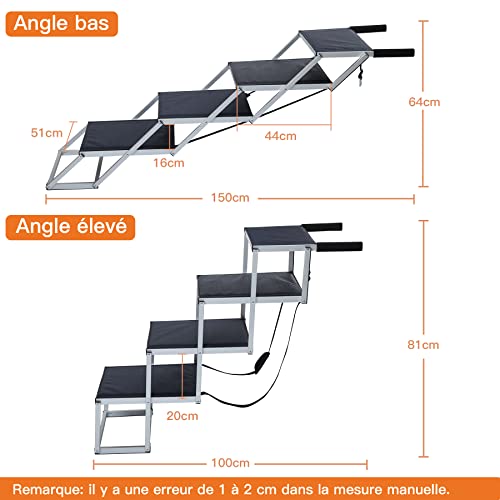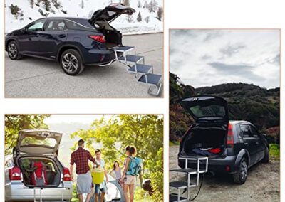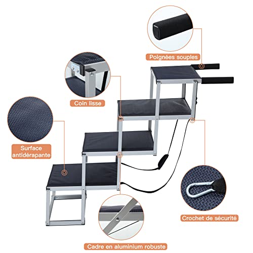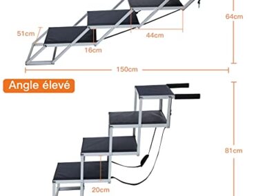 - 🚗【HAUTEUR RÉGLABLE ET APPLICATION UNIVERSELLE】 – L’escalier de voiture pour chien au design télescopique peut facilement ajuster sa hauteur (64-81 cm) pour s’adapter à la plupart des voitures, SUVs, camions. La largeur des marches d’escalier pour chiens est d’environ 44 cm et varie en fonction de leur extension en hauteur.