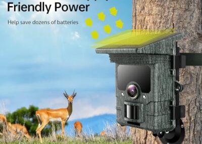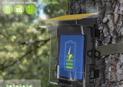 - Alimentation solaire et batterie supplémentaire : Avec une capacité de batterie solaire de 2600 mAh et un compartiment de batterie supplémentaire, vous pouvez être sûr que votre caméra de chasse est toujours alimentée en énergie. Cette solution durable garantit que vous pouvez utiliser la caméra pendant de longues périodes sans vous soucier de l’alimentation électrique.