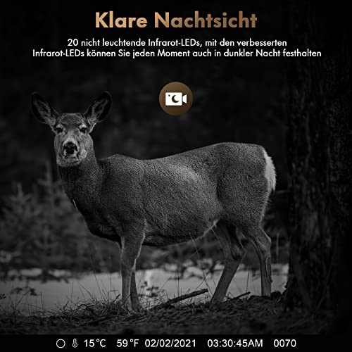 - Grand angle de 120 ° et vitesse de déclenchement 0,1 s : la caméra pour animaux sauvages a la vitesse de déclenchement la plus rapide et étonnante. Dès que le mouvement d’un animal est détecté, la caméra de chasse nocturne se déclenche immédiatement en 0,1 seconde. La distance de déclenchement et de détection de mouvement peut atteindre jusqu’à 20 m, offre un angle de détection visible de 120°. Idéal pour la surveillance de la ferme, la chasse au cerf en plein air et la sécurité domestique.