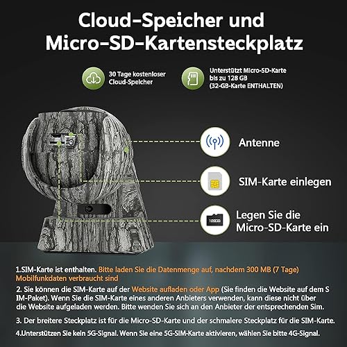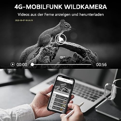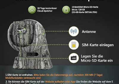 - Réseau cellulaire 4G pour un accès à distance : la caméra de chasse peut être connectée via le réseau mobile 4G dans l’application téléphone, ce qui vous permet de visualiser et de télécharger des vidéos en direct à distance. Convient pour les sentiers sauvages sans wifi. Livré avec carte SIM 4G prépayée (300 Mo de données de traçage gratuites pour la caméra de chasse gratuitement) pour l’essayer gratuitement. Cette caméra de chasse est une version européenne qui s’applique uniquement à l’Europe