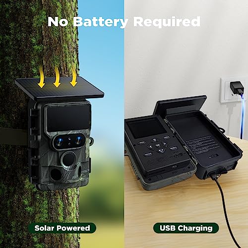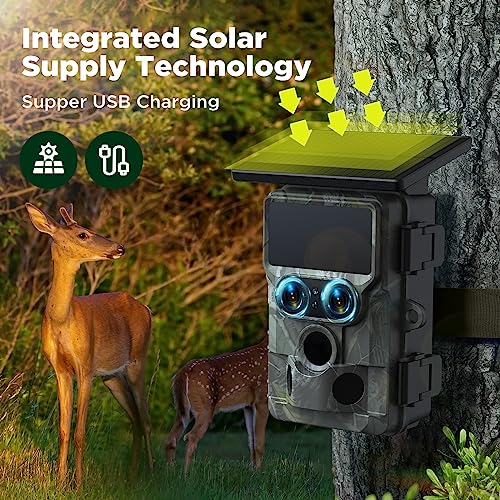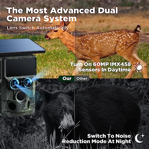 VOOPEAK Camera de Chasse Solaire Double Objectif, 4K 60MP Camera de Chasse WiFi Bluetooth, Caméra de Chasse Infrarouge Nocturne Activée par Mouvement IP66 Étanche pour Surveillance de la Faune