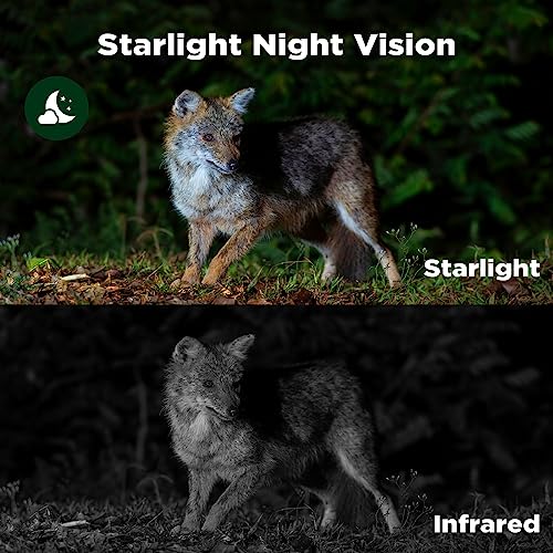 - 【Innovante à Double Objectif & Superbe Vision Nocturne Starlight】Dotée d’une optique à double lentille, cette caméra de chasse unique peut prendre des images et des vidéos claires et en couleur en plein jour. La fonction supérieure de vision nocturne à la lumière des étoiles, conçue pour la meilleure expérience de vision nocturne, vous permet de capturer des images en couleur dans des conditions de faible luminosité.