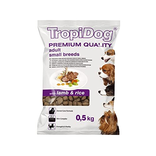 - TropiDog Premium Adult SMALL BREEDS – with LAMB and RICE est une nourriture Prémium avec agneau et riz pour chiens adultes de petites races (>10 mois).